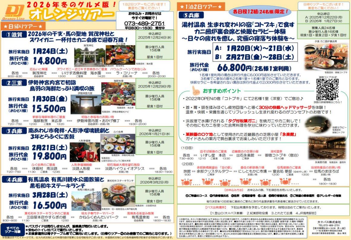 大十バス株式会社では、紀美野町・海南市各主要施設および駅より、各観光地へと向かうオリジナルバスツアー【オレンジツアー】を開催しております。