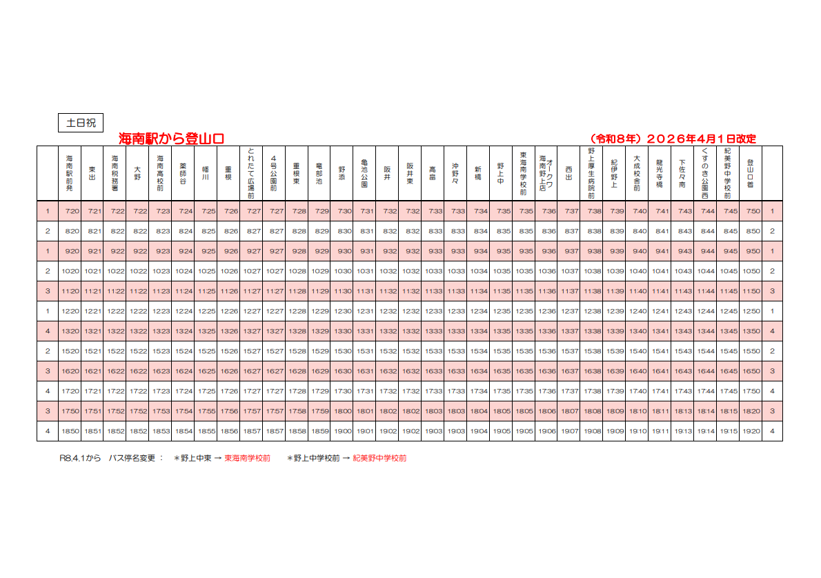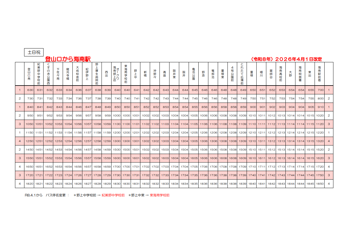 各停留所時刻表(土日上り・下り)※令和8年4月1日から