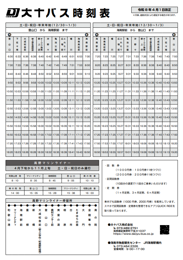 大十バス株式会社営業所隣接の「登山口停留所」より「JR海南駅前」までを結ぶ路線バスです。日々の通勤・通学・通院・お買い物にぜひご利用ください。