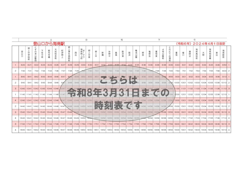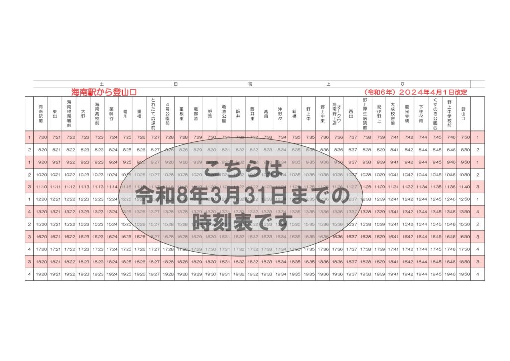 各停留所時刻表(土日上り・下り)※令和8年3月31日まで