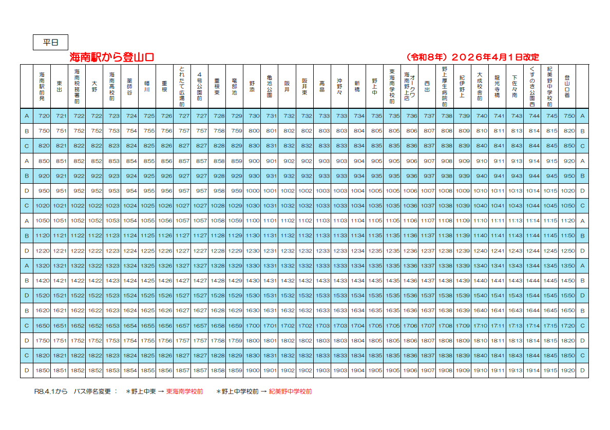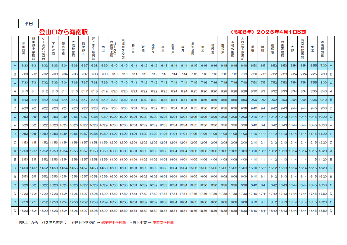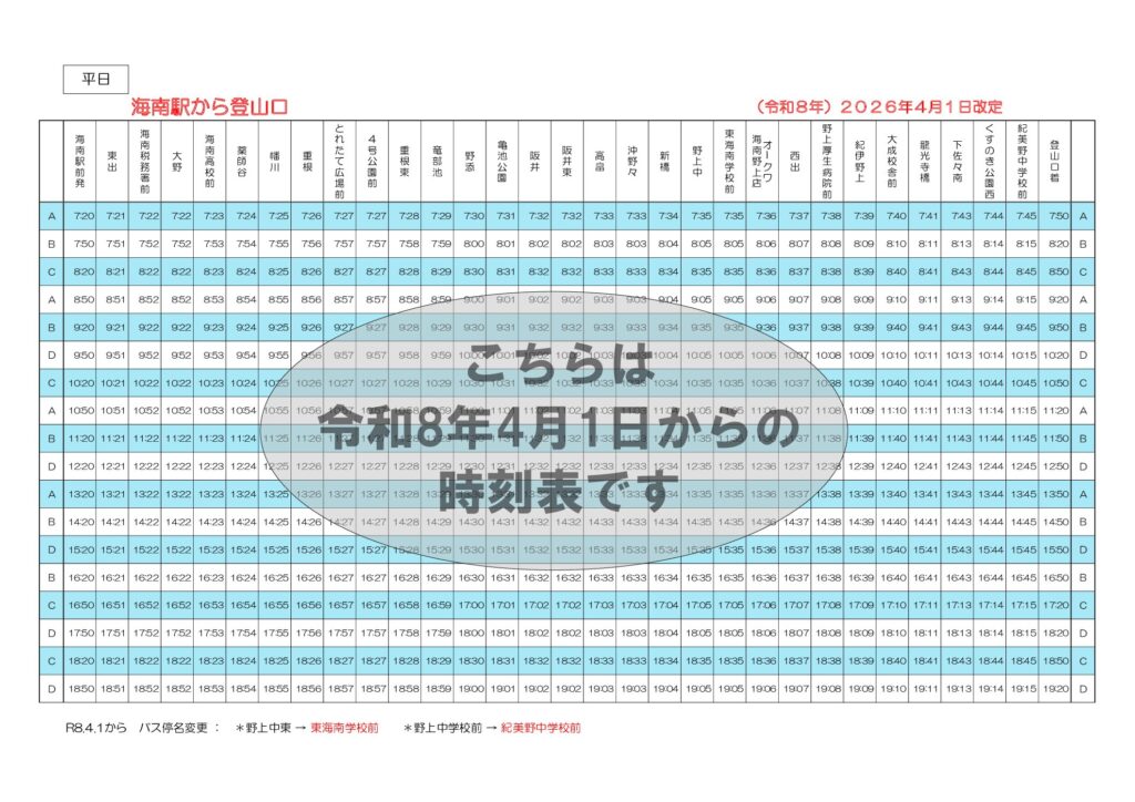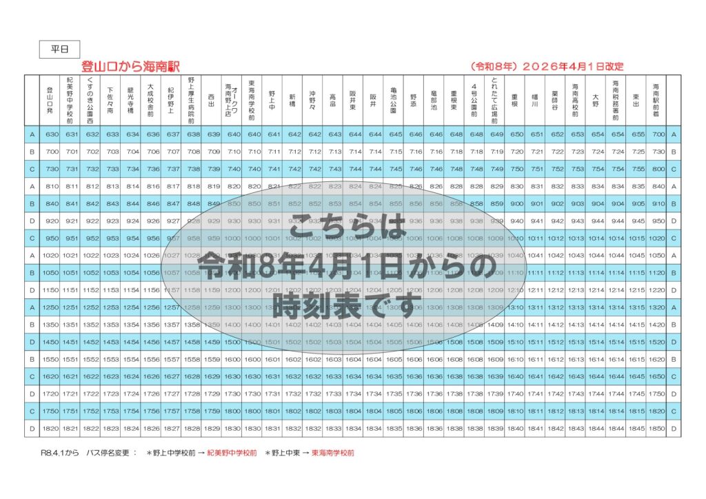 各停留所時刻表(平日上り・下り)※令和8年4月1日から